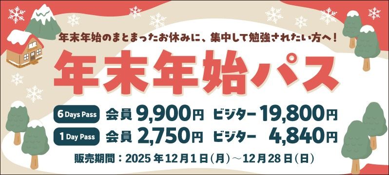 「年末年始パス」は、上記休業期間内に特別に勉強カフェをご利用いただけるパスです。